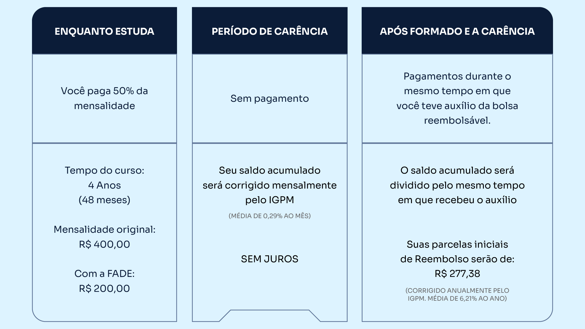 Em uma Instituição conveniada com a FADE, a mensalidade do curso, emitida pela Instituição, terá em seu valor o descontado correspondente à bolsa reembolsável, e a FADE pagará a diferença (valor da bolsa) diretamente para a Instituição.